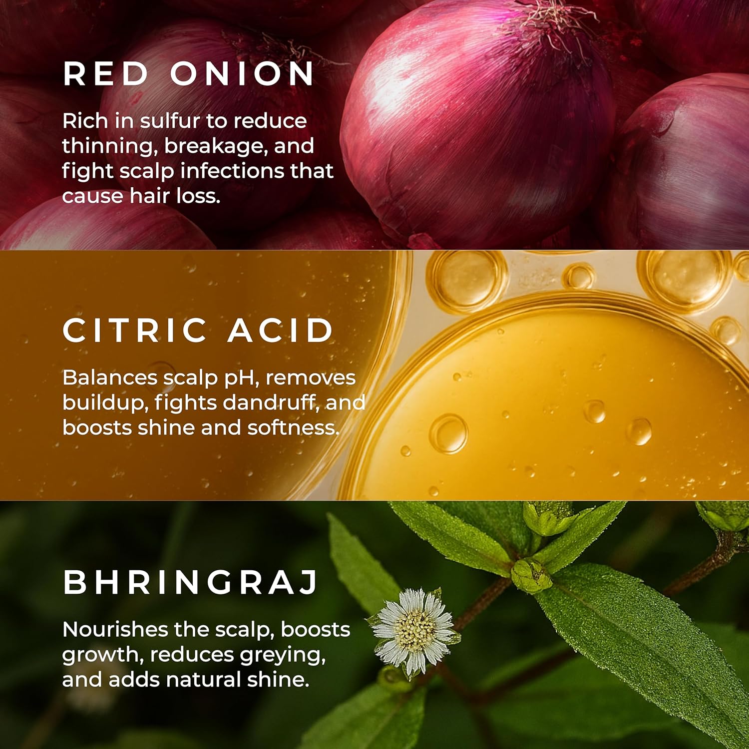 - Strengthens Hair: Bhringraj and Red Onion work together to fortify each strand against breakage.